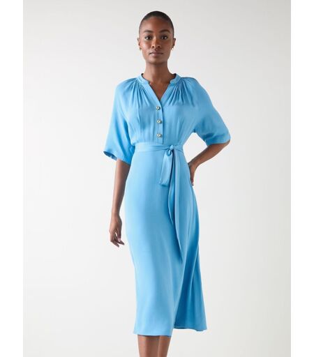 The Amber dress is a blue satin midi design made from sustainable FSC fabric. This smart casual women s clothing piece features a V-Neck, short sleeves and a raglan silhouette. The self-covered tie belt defines the waist, while gold metal ball buttons add a refined touch. This dress combines style with sustainability. Pair with strappy heels and statement earrings for a complete woman's outfit for summer events, or add a tailored blazer for formal occasions. Machine washable. 100% Viscose. ...