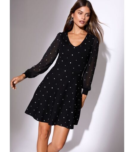 Be the best dressed this party season in this gorgeous embellished hotfix skater mini knit dress! Style with heels for a glam party look. Model wears a size 8 and is 5'10. Main 50% Viscose, 31% Polyester, 19% Nylon. Sleeves 100% Polyester. ...