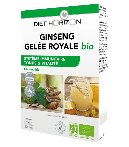 Complément alimentaire à base de préparations de plantes et gelée royale bio • Ginseng pour le tonus, la vitalité, l’immunité et les périodes de fatigue et de stress • Arôme naturel de pêche • Programme de 20 jours • Fabriqué en France . Diet Horizon vous propose GINSENG GELÉE ROYALE, l'alliance du Ginseng Rouge bio de 6 ans d'âge pour maintenir tonus et vitalité ainsi que de la Gelée Royale bio ! Ce complément alimentaire à la formule complète est composé de gelée royale bio (1000 mg) titrée à 1,3% de 10-HDA et de préparations de plantes dont du : • Ginseng rouge bio 6 ans d’âge (2000 mg), titré à 1% de ginsénosides, reconnu pour contribuer au bon fonctionnement de système immunitaire et soutenir l'organisme pendant les périodes de fatigue et de stress • Jus concentré d’orange bio Complément alimentaire à base de préparations de plantes et de gelée royale Le saviez-vous ? GINSENG L’usage du ginseng remonte à plus de 5000 ans en Corée et en Chine. Cette plante vivace est utilisée traditionnellement en Chine depuis plus de 2000 ans. L’âge d’une racine de Ginseng détermine sa qualité et sa teneur en ginsénosides, substances naturelles actives du Ginseng. La couleur rouge du Ginseng est due à un procédé de traitement à la vapeur après la récolte. Ce procédé traditionnel sert à conserver naturellement les molécules actives. Pour terminer, les racines sont séchées et transformées en extrait. GELÉE ROYALE La croissance très rapide de la reine des abeilles et sa longévité exceptionnelle éveillèrent très tôt la curiosité des scientifiques. La clé de l’énigme réside dans une gelée aux reflets nacrés dont la reine des abeilles est exclusivement nourrie : la gelée royale. ...