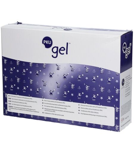 DescriptionAliment diététique destiné à des fins médicales spéciales PKU gel est un substitut de protéines en poudre, sans phénylalanine destiné au traitement diététique de la Phénylcétonurie, contenant un mélange d’acides aminés essentiels et non essentiels, des glucides, des vitamines et des minéraux. Le PKU gel est proposé en versions non aromatisée et pré-aromatisées (orange et framboise). Les versions pré-aromatisées contiennent des édulcorants. DosageChaque sachet de PKU gel (24g) contient 10g d’équivalent protidique. Le PKU gel non aromatisé peut être parfumé, si désiré, avec les sachets d’arôme FlavourPac (parfums disponibles : citron, cassis, framboise, orange, tropical). Les sachets d’arôme peuvent être utilisés dès l’âge de 1 an. AVIS IMPORTANT - Produit uniquement pour personnes atteintes de Phénylcétonurie - Produit soumis à prescription médicale obligatoire - Ne peut constituer la seule source d’alimentation - Ne pas utiliser par voie parentérale - PKU gel non aromatisé convient aux enfants dès 6 mois - PKU gel orange ou framboise convient aux enfants dès 1 an.IndicationPKU gel est un aliment diététique destiné à des fins médicales spéciales, destiné à compléter les besoins nutritionnels des enfants dès 6 mois atteints de Phénylcétonurie. La version non aromatisée convient aux enfants dès 6 mois. Les versions pré-aromatisées conviennent aux enfants dès 1 an.UsageLa quantité journalière de PKU gel nécessaire pour compléter les besoins nutritionnels quotidiens est à déterminer par le prescripteur (le médecin ou le/la diététicien(ne)) en fonction de l’âge, du poids corporel, la tolérance en phénylalanine et des paramètres biologiques du patient et doit être adaptée de façon régulière par le prescripteur. 1. Les besoins quotidiens en protéines sont apportés sous la forme de PKU gel. 2. Les besoins complémentaires en protéines dérivent du métabolisme des protéines alimentaires consommées aux quantités prescrites. Ceci permet de contrôler les apports en phénylalanine, qui est essentielle à la croissance et au développement. 3. Des aliments riches en glucides et en lipides mais pauvres en protéines doivent être prévus pour assurer les apports en énergie complémentaires. ...