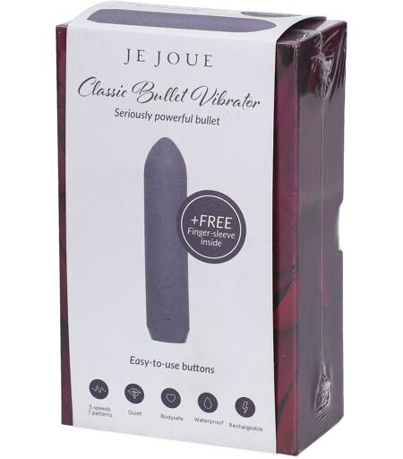 Je Joue a conçu trois stimulateurs Bullet différents : Le classique avec sa bague de doigt – la quintessence du stimulateur externe conçu pour des plaisirs très localisés. Le Rabbit – un rabbit souple et puissant élégamment conçu pour une sensation d’étreinte unique au niveau du clitoris. Le G-Spot – un modèle incurvé et intense dessiné pour épouser les contours les plus intimes de votre anatomie. Petits, élégants et discrets, les stimulateurs compacts Bullets de Je Joue ont été pensés comme un parfait prélude à vos jeux en solo ou en couple. Parfaitement subtil pour titiller ou caresser durant les préliminaires, le Bullet est toutefois suffisamment puissant pour faire frémir tout votre corps - vous pouvez même vous permettre de le lover au creux de vos mains et profiter de ses vibrations puissantes, jusqu’au bout de vos doigts, pour des caresses encore plus sensuelles. La petite taille du Bullet n’ôte rien à sa puissance. Ses vibrations profondes et puissantes se propagent jusqu’à atteindre vos terminaisons nerveuses les plus sensibles, créant ainsi des vibrations profondément intenses. La vibration unique de Je Joue garantit une stimulation profonde et efficace en vous évitant toute sensation d’engourdissement ou d’irritation souvent causées par une sur-stimulation superficielle. 5 vitesses - 7 modes - rechargeable.Fonctionnement Afin de mettre en marche le masseur maintenez le bouton « + » jusqu’à ce que le témoin lumineux s’allume et qu’il se mette à vibrer. Appuyez sur le bouton « + » afin d’augmenter l’intensité des vibrations. Appuyez sur le bouton « - » afin de diminuer l’intensité des vibrations. Appuyez sur le bouton du milieu « ~ » afin de changer les modes de vibration. Le stimulateur dispose de 5 niveaux d’intensité et de 7 modes de vibration. Afin d’éteindre le stimulateur, maintenez le bouton « - » jusqu’à ce que le témoin lumineux s’éteigne que le masseur cesse de vibrer. Lubrifiants et nettoyageUtiliser exclusivement des lubrifiants à base d’eau ou d'huile végétale. Il est également recommandé de laver le stimulateur à l’eau tiède et au savon. Veuillez lire le mode d'emploi avant l'utilisation. ...