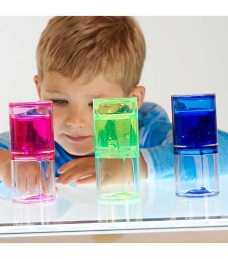 Set de 3 sabliers liquides Ce set est un ensemble de trois grandes tours sensorielles, chacune contenant un liquide coloré qui cascade vers le bas. Lorsqu'ils sont retournés, les sabliers offrent des variantes de jeux fascinants pour les petits comme les grands ! C'est un jeu idéal pour développer la concentration, la curiosité ainsi que le language créatif de l'enfant. Laissez votre enfant s'imprégner de ce jeu, il éveillera ses sens et développera ses facultés motrices et sensorielles. Ce que votre enfant peut développer avec ce jeu : * Développement personnel : les sens - la concentration * Développement physique : compétences motrices * Comprendre le monde : les couleurs Dimensions : Taille du sablier : 12 x 5 cm Age : + 3 ans Fabricant : TICKIT - Fabriqué en Chine. ...