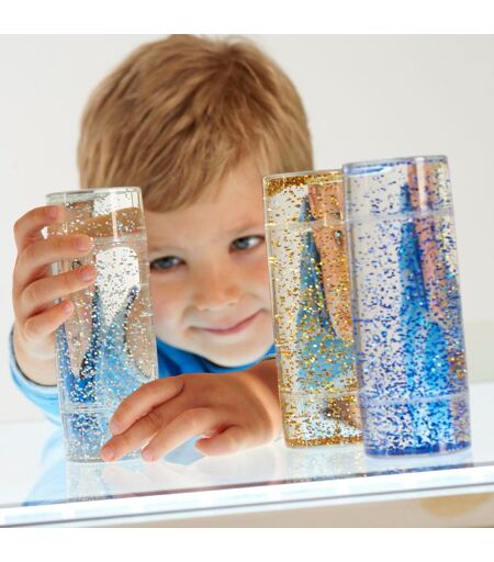 Set de 3 sabliers pailletés Ce set est un ensemble de trois grandes tours sensorielles, chacune contenant des paillettes colorées qui cascadent et tourbillonnent vers le bas. Lorsqu'ils sont retournés, les sabliers offrent des variantes de jeux fascinants pour les petits comme les grands ! C'est un jeu idéal pour développer la concentration, la curiosité ainsi que le language créatif de l'enfant. Laissez votre enfant s'imprégner de ce jeu, il éveillera ses sens et développera ses facultés motrices et sensorielles. Ce que votre enfant peut développer avec ce jeu : * Développement personnel : les sens - la concentration * Développement physique : compétences motrices * Comprendre le monde : les couleurs Dimensions : Taille du sablier : 14 x 5 cm Age : + 3 ans Fabricant : TICKIT - Fabriqué en Chine. ...