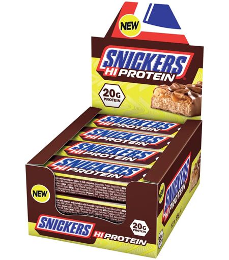 Si tu adores les Snickers, tu vas kiffer les Snickers Protein Bar en format boite de 12 ! Imagine ta barre préférée avec son caramel fondant, ses cacahuètes croquantes, et son enrobage de chocolat au lait, mais version protéinée. Chaque Snickers Protein Bar, contient entre 211 et 250 calories et 15 à 22 g de protéines selon le parfum. Tu bénéficies ainsi de tous les avantages nutritionnels d'une barre protéinée, sans sacrifier le goût légendaire de Snickers. Le combo parfait de cacahuètes, caramel et chocolat avec un cœur moelleux de nougat. La version allégée réussit le tour de force d'être faible en calories tout en conservant la texture et saveur incomparables. Développée par Mars Protein, la barre Snickers Protein est conçue avec un mélange de protéines haut de gamme : isolat de protéine de lactosérum et isolat de protéine de lait, assurant un apport constant d’acides aminés à tes muscles pour favoriser la croissance musculaire et limiter le catabolisme. Chaque barre Snickers Protein Bar t'apporte des protéines, et aussi de l'énergie avec environ 20 g de glucides. Les cacahuètes, en plus, offrent des bons acides gras (8-9 g) essentiels pour ton système hormonal, avec seulement 3 g d’acides gras saturés. En plus, tu en as pour tous les goûts : Snickers original (12x63g), Snickers Peanut Butter (12x57g), Snickers White Chocolate (12x62g), Snickers Crispy Chocolate (12x55g) ou Peanut Brownie (12x50g). ...