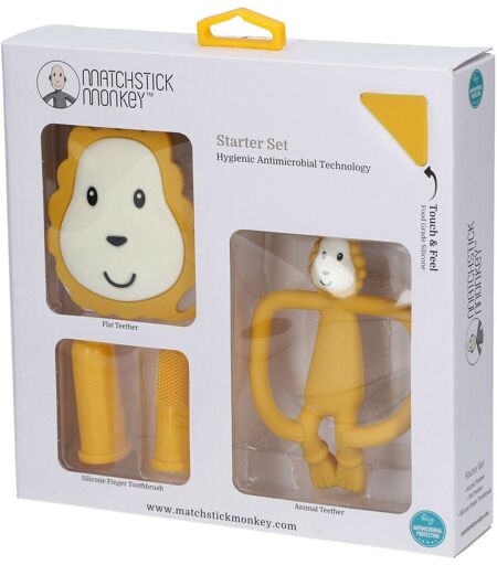 MATCHSTICK MONKEY™ Starter Set Lion Ce kit de démarrage fournit tous les jouets de dentition nécessaires lorsque les dents de bébé commencent à pousser ! 1x jouet de dentition Flat Face : petit et léger, parfait pour les petites mains et pour être transporté sur un attache-tétine, par exemple. Doté de la protection BioCote®, une technologie anti-microbienne. 1x jouet de dentition Monkey Teether : un jouet de dentition innovant doté de la technologie anti-microbienne BioCote®. Les bosses à l'arrière de la tête contribuent à masser les gencives douloureuses. Les bras permettent de le saisir facilement et de développer la motricité de votre enfant. 1x brosse à dents à doigts en silicone : douce pour les gencives des petits ! Un moyen idéal pour s'entraîner au brossage des dents et pour masser les gencives douloureuses ou appliquer un gel apaisant. Dotée de la protection BioCote®, une technologie anti-microbienne. Indications A partir de 3 mois Conseils d'utilisation À utiliser pour vos petits. ...