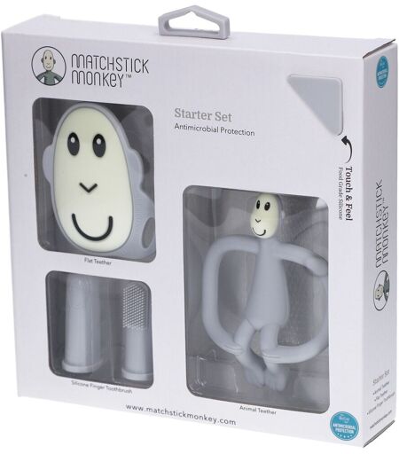 MATCHSTICK MONKEY™ Starter Set Singe gris Ce kit de démarrage fournit tous les jouets de dentition nécessaires lorsque les dents de bébé commencent à pousser ! 1x jouet de dentition Flat Face : petit et léger, parfait pour les petites mains et pour être transporté sur un attache-tétine, par exemple. Doté de la protection BioCote®, une technologie anti-microbienne. 1x jouet de dentition Monkey Teether : un jouet de dentition innovant doté de la technologie anti-microbienne BioCote®. Les bosses à l'arrière de la tête contribuent à masser les gencives douloureuses. Les bras permettent de le saisir facilement et de développer la motricité de votre enfant. 1x brosse à dents à doigts en silicone : douce pour les gencives des petits ! Un moyen idéal pour s'entraîner au brossage des dents et pour masser les gencives douloureuses ou appliquer un gel apaisant. Dotée de la protection BioCote®, une technologie anti-microbienne. Indications A partir de 3 mois Conseils d'utilisation À utiliser pour vos petits. ...
