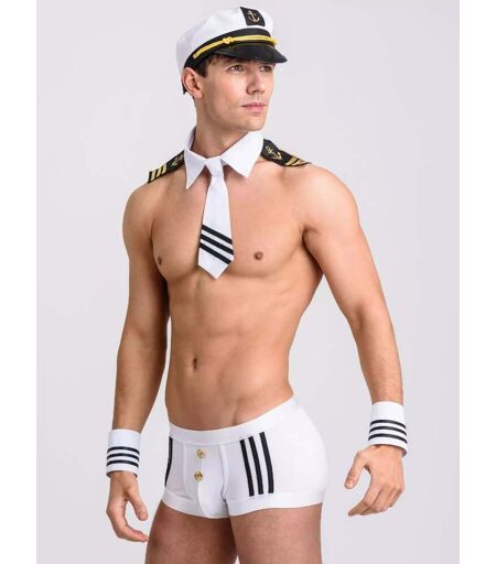 Expérimentez le plaisir sur d'autres rivages avec ce costume marin Seaman de la marque LHM ! Composé d'un boxer, d'une paire de manchettes, d'un col et d'une casquette, ce costume de marin sexy saura vous faire voguer sur les océans de la passion ! Minimaliste mais pas dénué d'un charme ravageur, le boxer blanc à rayures noires et boutons dorés s'ajustera à la perfection à votre silhouette pour souligner toute l'étendue de vos charmes. Une fois associé aux manchettes et à la cravate assorties ainsi qu'aux épaulettes et à la casquette de marin noires à détails dorés, votre partenaire ne pourra nullement empêcher le désir de prendre le large ! Composition : 90% polyester, 10% élasthanne. Accessoires : 100% polyester ...