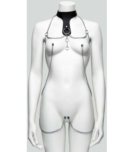 Voici un collier qui ne se contente pas d'être décoratif : il devient un véritable terrain de jeu sensoriel. Conçu en cuir robuste et orné de chaînes métalliques, ce collier BDSM signé DOMINIX propose quatre pinces réglables à embouts en PVC, prêtes à s'attacher aux tétons, aux lèvres de la vulve ou au clitoris, selon l'inspiration du moment. Chaque pince peut être ajustée pour trouver le niveau de pression idéal, de la douce pression à la morsure plus marquée. Le collier, quant à lui, se règle entre 35,5 et 45,7 cm pour s'adapter parfaitement à votre tour de cou. Les chaînes, longues de 40 à 45 cm, offrent assez de jeu pour créer des combinaisons variées, que ce soit devant, derrière, ou en diagonale, selon les envies du moment. Une chaîne permet même d'attacher l'ensemble autour de la taille pour une mise en scène encore plus complète. Le contact froid du métal, combiné à la pression des pinces, intensifie la circulation sanguine et accentue les sensations, rendant chaque caresse ou vibration suivante d'autant plus délicieuse. Et lorsqu'il est porté avec d'autres accessoires de la gamme DOMINIX, ce collier transforme une simple session en une véritable expérience BDSM à part entière. Ce bijou de domination, à la fois esthétique et redoutablement efficace, s'adresse à celles et ceux qui veulent aller plus loin dans le jeu, avec raffinement et intensité. Pour que chacun·e prenne du plaisir en toute sécurité, la communication, le consentement et la connaissance des risques liés à vos pratiques sont essentiels au bon déroulement de vos jeux BDSM. ...