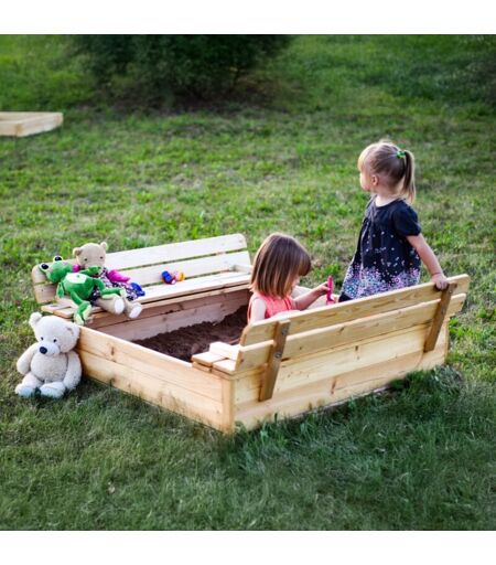 TIMBELA Bac à sable en bois avec couvercle et banc rabattables - 118 x 122 x H20 cm, bac à sable avec couvercle, bac à sable pour enfants, bac à sable en