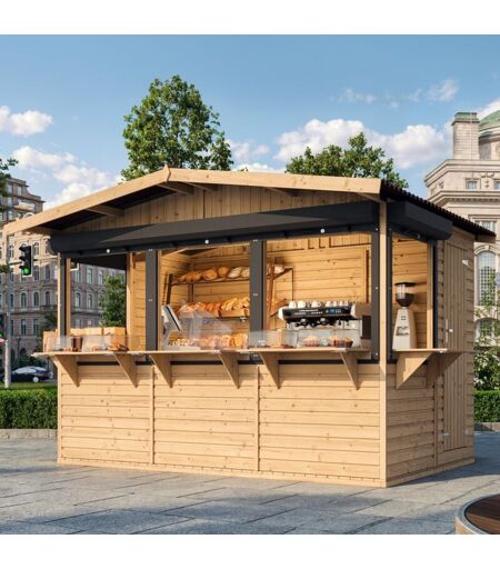 TIMBELA M150BZ Maison de jardin en bois, Étal de marché en bois, Grand stand de vendeur avec comptoir 263 x 336 cm / 6 m²