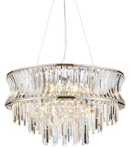 Merano Vittoria Plafonnier Suspendu Plaque Nickel Brillant, Cristal Et Verre Transparent Finition : plaque de nickel brillant avec cristal et verre transparent Matériel: Acier,Verre Indice IP : IP20 Hauteur minimale : 49 cm Hauteur maximale : 186,5 cm Diamètre : 61 cm Type de lampe : E14 Nombre de lampes : 9 Ampoule incluse : non Intensité variable : Intensité variable Poids : 10,3 kg Puissance (maximale) : 6 W ...
