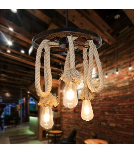 AXHUP Lustre Suspension Industrielle E27 Plafonnier Luminaire en Corde de Chanvre Noir 3 Lumières 1PCS