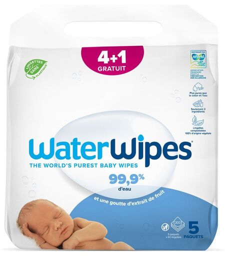 Les lingettes WaterWipes humides sont les lingettes les plus pures grâce à leur formule unique et brevetée à base de 99,9% d'eau et 0,1% d'extrait de fruit. Ainsi, elles préservent la peau fragile de bébé et aident à réduire les réactions inflammatoires.Sans parfum, ni alcool, les WaterWipes ne contiennent pas de composants chimiques pour "lier" l'humidité aux lingettes. Elles peuvent donc être utilisées dès la naissance, sans aucun risque pour les peaux les plus délicates des bébés.IndicationsPour le nettoyage de la peau sensible des bébés.Conseils d'utilisationFermez toujours l'emballage avec l'autocollant. Vous pouvez mettre le paquet à l'envers, presser doucement et masser pendant quelques secondes. L'eau est ainsi répartie de manière homogène dans l'emballage et les lingettes retrouvent le taux d'humidité constant qu'elles avaient lors du processus de fabrication en laboratoire.Composition99,9% Aqua (eau), 0,1% Citrus grandis seed extract (extrait de pépins de pamplemousse).Les lingettes WaterWipes sont composées de 20 % de viscose et de 80 % de polyester.Conditionnement5 paquets de 60 lingettes = 300 lingettes ...