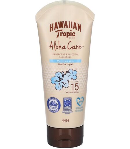 Dites aloha à une protection solaire légère et non grasse qui matifie la peau, pour l'aider à paraître et à se sentir au mieux de sa forme. La lotion solaire Hawaiian Tropic Aloha Care™ protège, embellit et soigne votre peau au soleil. Améliorez votre temps au soleil avec une protection fiable contre les UVA et UVB et le parfum emblématique d'Hawaiian Tropic pour séduire vos sens en été. Les personnes, les animaux et notre planète sont au cœur de tout ce que nous faisons, c'est pourquoi nous sommes contre les tests sur les animaux et notre formule ne contient pas d'oxybenzone ni d'octinoxate. Indications Protection solaire SPF15. Conseil d'utilisation Appliquer la crème 20 minutes avant de vous exposer au soleil. 3 cuillères à soupe par application pour la totalité du corps. Renouveler fréquemment l'application pour maintenir la protection. Composition Aqua, Homosalate, Octocrylene, Ethylhexyl Salicylate, Diisopropyl Adipate, Butyl Methoxydibenzoylmethane, Silica, Cetearyl Alcohol, Glycerin, Phenoxyethanol, Tapioca Starch, VP/Eicosene Copolymer, Diethylhexyl Butamido Triazone, Caprylyl Glycol, Acrylates/C12-22 Alkyl Methacrylate Copolymer, Acrylates/C10-30 Alkyl Acrylate Crosspolymer, Ceteth-10 Phosphate, Dicetyl Phosphate, Coco-Glucoside, Parfum, Chlorphenesin, Xanthan Gum, Sodium Hydroxide, Disodium EDTA, Sea Salt, Polymethylsilsesquioxane, Carica Papaya Fruit Extract, Mangifera Indica Fruit Extract, Passiflora Incarnata Fruit Extract, Plumeria Acutifolia Flower Extract, Psidium Guajava Fruit Extract, Hexyl Cinnamal, Linalool. ...