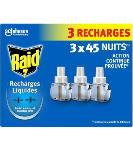 PROTECTION CONTINUE : Le diffuseur électrique liquide répulsif Raid offre une protection contre les moustiques et les moustiques tigres. NUITS SEREINES : Sa formule offre une action continue prouvée jusqu'à 45 nuits de 8 heures. Ne laissez plus les moustiques gâcher vos nuits ! Repoussez-les, avec le diffuseur éléctrique liquide Raid, la solution efficace pour des nuits sereines, sans la nuisance des moustiques ! FORMULE : Contient de l'huile d'Eucalyptus Citriodora, hydratée, cyclisée (une des substances actives répulsives). UNE BOÎTE CONTIENT : 3 recharges de 45 nuits. UTILISATION SIMPLE : Lorsque la recharge est vide, insérez une nouvelle recharge Raid en vissant le flacon-recharge dans le diffuseur jusqu'au bout. Utilisez les produits répulsifs avec précaution. Avant toute utilisation, lisez l¿étiquette et les informations concernant le produit. MAN date sur nos emballages signifie date de fabrication du lot et non date de péremption. ...