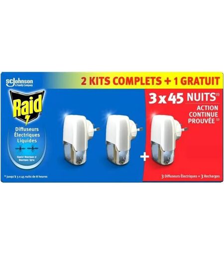 Raid Diffuseur Electrique Liquide - Répulsif Moustiques - 3 Diffuseurs + 3 Recharges, 2 en 1 - 45 Nuits