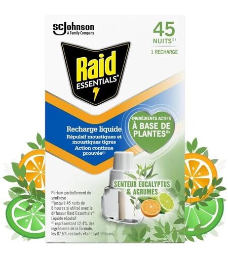 Raid Essentials Recharge Diffuseur Électrique Liquide- Répulsif Moustiques et Moustiques Tigres 45 Nuits - Senteur Eucalyptus et Agrumes - 1 Recharge ...