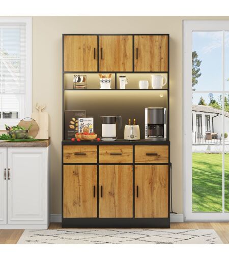 FORTUNA LAI Buffet de cuisine led - 100x40x180cm - Armoire avec tiroirs, étagères réglables, trous de gestion des câbles et prises - Naturel