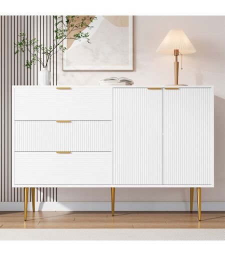 Fortuna Lai - Buffet 120x38x80.5cm - meuble avec 2 portes et 3 tiroirs - étagères intérieures, avec poignées et pieds dorés - Blanc