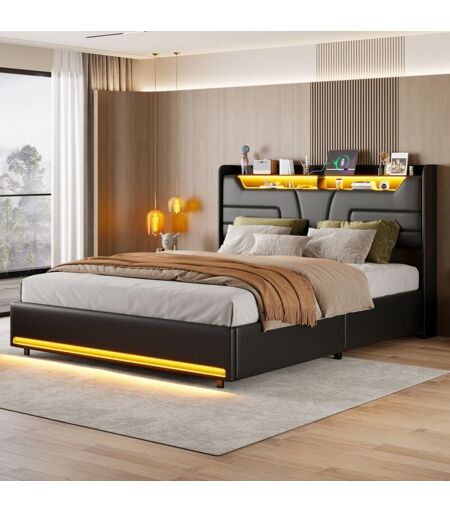 TANANT Lit coffre 160x200cm, lit double avec rangement, sommier à lattes en bois, tête de lit avec bande lumineuse LED et port de chargement USB, design,