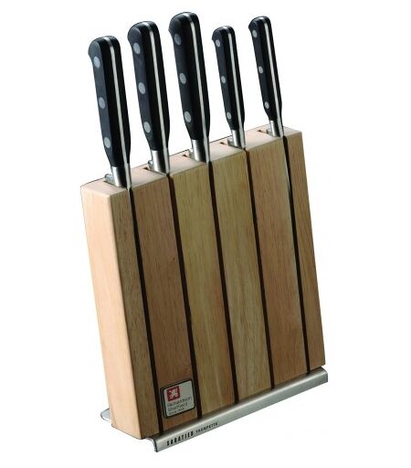Ce bloc couteaux Sabatier comprend 5 couteaux de cuisine : - 1 couteau d'office lame 10cm - 1 couteau universel lame 12,8cm - 1 couteau de Chef lame 15 cm - 1 couteau à découper lame 20cm - 1 couteau à pain lame 20cm Couteaux en acier trempé dur et flexible avec un manche reconnu en ABS sur toute la soie Les couteaux vont au lave-vaisselle Garantie 25 ans ! ...