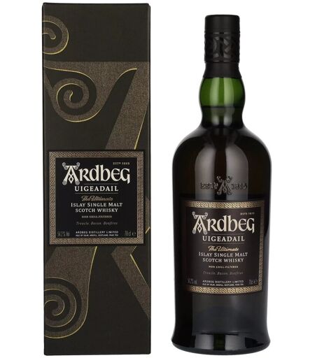 L'Ardbeg Uigeadail est un whisky single malt d'Islay primé, connu pour sa combinaison incomparable de fumée de tourbe intense et de notes douces de sherry. Nommé d'après le Loch Uigeadail, la source d'eau de la distillerie, ce whisky allie le fumé ca Couleur : ambre doré profond. Nez : Fumée de tourbe intense avec des notes de chocolat noir, de raisins secs, de cuir, de noix grillées et de bois de chêne épicé. Goût : Corsé et complexe avec du malt fumé, du sherry doux, du toffee, de l'espresso, ...