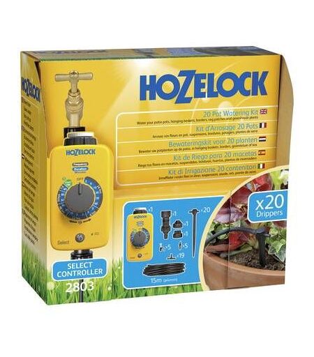 Hozelock Set pour goutte-à-goutte raccord enfichable Longueur tuyau: 15 m 2803 1240 Arrosage automatique de vos pots de fleurs, des plantes de serre, des remises et des légumes. Contrôlez automatiquement l'arrosage de vos plantes de 1 x par semaine jusqu'à 4 x par jour, en fonction des besoins de vos plantes. Max. Durée d'arrosage 60 minutes. Vous pouvez adapter de manière flexible la durée, la fréquence et le temps de démarrage de l'arrosage.. SET complet pour 20 pots de fleurs, avec contrôleur de sélection mécanique et tous les composants pour la mise en place d'un réseau d'eau de 4 mm avec 20 points d'arrosage.. . Arrosage automatique jusqu'à 20 pots de fleurs. Contrôle du temps d'arrosage de 1 x par semaine à 4 x par jour et max. 60 minutes. Efficace, économe en temps et en eau : 4 l/h. SET complet avec contrôleur Select Donnees techniques : Durée d'arrosage (max.) : 60 min Fréquence d'arrosage : personnalisé Longueur tuyau : 15 m Raccord tuyau : raccord enfichable Type d'installation : en surface ...