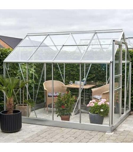 Ce modèle de serre en verre horticole est parfait pour le jardinier débutant, ou bien le professionnel. Elle pourra trouver sa place dans un jardin de petite taille, tout en permettant de réaliser un petit potager et protéger les plantes exotiques et agrumes. Cette serre de jardin est livrée avec :Une porte coulissante simple.Une lucarne.Un système de gouttière.Une embaseCaractéristiques Matière paroi : verre horticoleÉpaisseur vitrage : 3 mmMatière structure : aluminiumMatière visserie : aluminiumCouleurs : silver, forest green ou noirLargeur : 1.93 mLongueur : 2.57 mLargeur porte ouverte : 1.20 mHauteur sous faîtage (hors embase) : 1.96 mHauteur sous faîtage (avec embase) : 2.08 mHauteur passage de porte (hors embase) : 1.60 mHauteur passage de porte (avec embase) : 1.72 mSurface au sol : 5 m²Angle du toit : 35°Hauteur de gouttière (avec embase) : 1.34 mHauteur de gouttière (sans embase) : 1.22 mSurface totale pour plastique à bulles : 20 m²Garantie : 12 ans ...