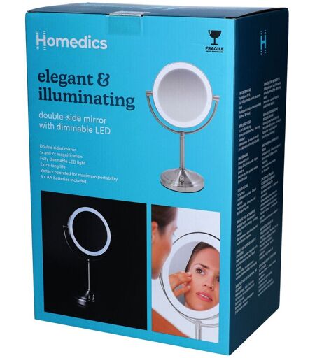 Homedics Ordless Led Compact Deluxe Mirror HM MIR 8160Miroir lumineux sans fil.• Miroir double face - Grossissement x1 et x7 - Rotation 360°• Éclairage LED avec une longue durée de vie, une faible consommation d'énergie et une intensité réglable.• Sans fil - pratique, portable et fiable - fonctionne avec 4 piles AA (incluses)• Finition Luxe en acier inoxydable - pas de traces de doigts, pas d'étalement de la peinture• Geen de refletApplicationMiroir sur pied pour l'intérieur. ...
