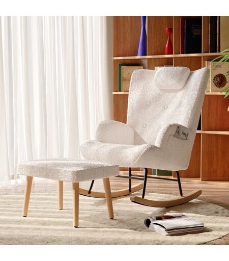 DANS LES NUAGES Fauteuil à bascule, avec tabouret, poches latérales, dossier, appui-tête, cadre en métal, accoudoirs, Rocking chair de capitonné en sherpa - Blanc