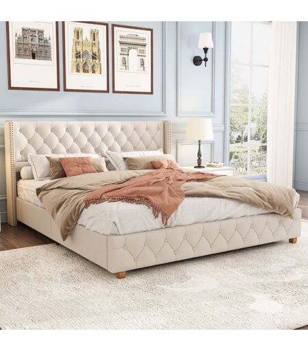 Tissu raffiné et durable : Ce lit rembourré est revêtu d'un tissu exquis, offrant une texture naturelle et élégante. Facile à entretenir, il garantit à la fois longévité et esthétique intemporelle. Détails capitonnés avec boutons : La tête et le pied du lit sont ornés de capitonnage avec boutons, ajoutant une dimension visuelle et une texture sophistiquée, rehaussant ainsi le charme classique de votre chambre. Touches décoratives élégantes : Les ailes latérales de la tête de lit sont embellies avec deux rangées de clous décoratifs, apportant une élégance subtile et un raffinement supplémentaire à l'ensemble du design. Pieds robustes pour une stabilité accrue : Les pieds du lit sont solides et renforcés, assurant une stabilité exceptionnelle et une durabilité à long terme pour un sommeil sans souci. Rembourrage doux pour un confort supérieur : Le rembourrage moelleux offre un confort optimal, garantissant une expérience de sommeil agréable et reposante chaque nuit. Spécifications du ...