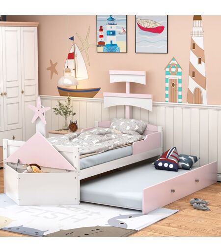 Dans Les Nuages - Lit gigogne 90x190 cm/90x200 cm, avec tête de lit en forme de bateau à voile, sommier à lattes en bois, lit princesse simple de