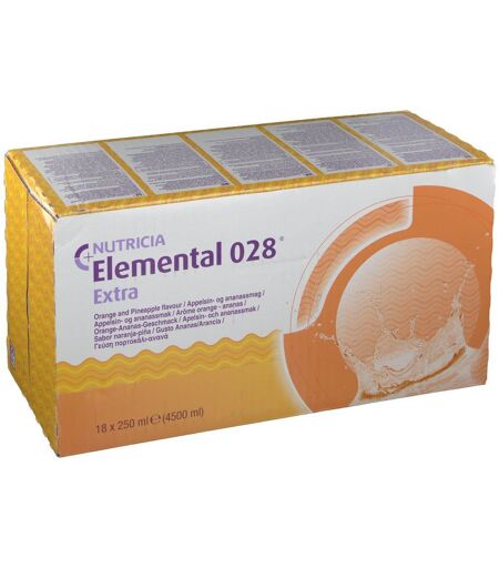Il est important d'avoir une alimentation variée et équilibrée et un mode de vie sain.ELEMENTAL 028 EXTRA LIQUIDE est un mélange spécial nutritionnellement complet, prêt à l’emploi, contenant des acides aminés essentiels et non essentiels, des lipides dont 35% de TCM, des glucides, des vitamines, des minéraux et des oligo-éléments.Denrée alimentaire destinée à des fins médicales spécialesIndications: Pour la gestion du régime en cas de malnutrition due à une maladie, surtout en cas de troubles de l'utilisation des nutriments (par exemple en cas de maladie de Crohn, de colite ulcéreuse, d'entérite radique, de syndrome de l'intestin court) et d'intolérance aux protéines du lait.Ingrédients:Eau, maltodextrines, sucre, arôme1, TCM (Coprah), huiles végétales (tournesol, colza), exhausteur de goût (E3301,2, E 2961,3), arôme2, L-aspartate de L-lysine, stabilisants (E460(i), E466), émulsifiants (E471, E472(e)), L-leucine, L-arginine, L-phénylalanine, L-proline, sirop de glucose déshydraté, L-valine, L-isoleucine, glycine, N-acétyl de L-méthionine, L-thréonine, citrate trisodique, glycérophosphate de calcium, L-histidine, L-sérine, orthophosphate de potassium, L-alanine, citrate tripotassique, acétate de magnésium, L-tryptophane, chlorure de calcium, chlorure de sodium, bitartrate de choline, acide L-ascorbique, L-tyrosine, édulcorant artificiel (acésulfame K), L-cystine, taurine, sulfate ferreux, sulfate de zinc, L-carnitine, myo-inositol, acétate de DL-alpha-tocophérol, nicotinamide, D-pantothénate de calcium, sulfate de manganèse, antioxydant (E307), colorants (E160(a), E162)12, sulfate de cuivre, hydrochlorure de pyridoxine, mononitrate de thiamine, riboflavine, palmitate de vitamine A, acide folique, molybdate de sodium, chlorure de chrome, iodure de potassium, hydrogénosélénite de sodium, vitamine K1, D biotine, vitamine D3, cyanocobalamine.Conseils d'uitlisation:En cas d'alimentation complémentaire ou exclusive, selon les besoins individuels ainsi que ceux spécifiques à l'âge et au sexe, conformément aux recommandations du médecin.Elemental 028 est prêt à l'emploi et disponible en Tetra Pak pratique (250 ml). Il est particulièrement délicieux lorsqu'il est réfrigéré.Remarque : à utiliser uniquement sous surveillance médicale. Uniquement pour l'alimentation entérale.Elemental 028 est un aliment destiné à des fins médicales spéciales (régime équilibré).Malnutrition et maladies gastro-intestinalesDe nombreuses maladies du tractus gastro-intestinal peuvent entraîner des problèmes de digestion et d'utilisation des nutriments. Les troubles de l'assimilation des nutriments sont également appelés malassimilation en médecine. Ils sont particulièrement fréquents en cas de maladie inflammatoire du pancréas (pancréatite), de syndrome de l'intestin court et de maladies inflammatoires chroniques de l'intestin (MICI).Lorsque les nutriments de nos repas quotidiens ne sont plus correctement absorbés par l'organisme en raison d'une maladie, des carences peuvent... ...