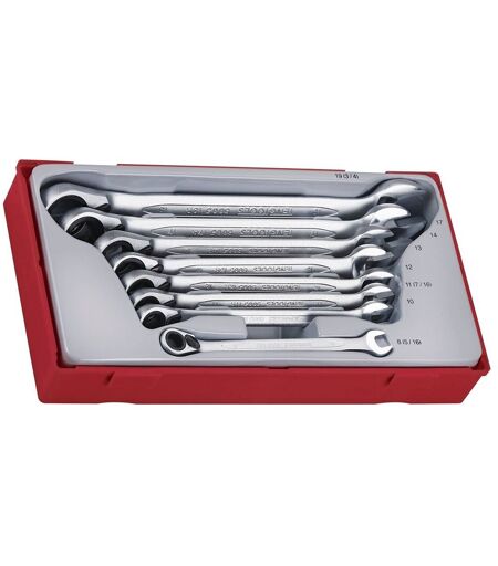 Set de 8 clés mixtes racagnac allant de 8 à 19mm dans un TC tray. Caractéristiques: Taille identique des deux côtés de la clé Côté racagnac avec angle d'inclinaison de 15° Cliquet d'inversion ...