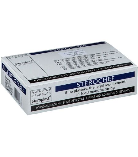 Taille du pansement: 5 formats différents Indications: Pansements à détection électromagnétique Description du produit: Pansements à détection électromagnétique La loi exige que les transformateurs d'aliments et toute personne manipulant des aliments utilisent des pansements bleus. Les pansements bleus Sterochef, détectables par électromagnétisme, sont recouverts d'un adhésif de qualité médicale et très collant, ce qui en fait la marque la plus fiable du marché. Lorsqu'ils sont appliqués sur une peau propre et sèche, ils restent en place, ce qui les empêche d'entrer dans la chaîne alimentaire. Ce qui pourrait être très coûteux si un rappel de lot était nécessaire. Pour la fabrication et la préparation des aliments Hypoallergénique et résistant au lavage Conforme aux réglementations sur l'alimentation et l'hygiène - SI1990 No.1431 Détectable au métal Stériles car emballés individuellement Confortable pour travailler Ces pansements contiennent-ils du métal ? Le pansement détectable aux métaux est composé d'une feuille d'aluminium à 100% (20µm) laminée sur une face du pansement absorbant non tissé. Conseils d'utilisation: Application rapide et facile sur la plaie. Conditionnement pansements x100 ...