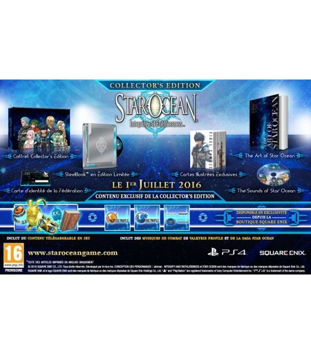Le jeu, dans un boîtier Steelbook¿ Collector's Edition, - Un artbook de 80 pages intitulé «The Art of Star Ocean» - Un CD de 16 morceaux des musiques du jeu intitulé «The Sounds of Star Ocean» - 8 cartes exclusives, illustrant certains des personnages de STAR OCEAN: Integrity and Faithlessness créés par le fameux concepteur de personnages akiman (série Street Fighter). ...
