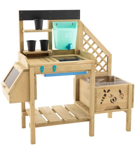 Initiez les enfants au jardinage et à la culture des plantes avec la table de rempotage Deluxe, équipée d'une jardinière Peekaboo, d'un treillis et d'une serre froide. La table de rempotage est équipée d'un tonneau de pluie avec robinet dans lequel on peut bien sûr verser de l'eau ordinaire. Le plateau de la table comporte un bac en plastique où l'on peut mettre de l'eau ou de la terre et où il y a suffisamment d'espace pour empoter les plantes. À côté du tonneau de pluie se trouvent des étagères sur lesquelles les pots fournis peuvent être placés. À l'avant de la table, deux crochets permettent de suspendre des outils tels qu'une pelle ou un râteau (non fournis). L'étagère inférieure permet de ranger de la terre ou des pots de rechange, par exemple. Plantez des graines dans la jardinière Peekaboo et regardez les plantes pousser, pas seulement en surface, car grâce à la fenêtre d'observation amusante et facile à soulever, vous pouvez également voir comment les plantes poussent en dessous du sol. Faites pousser des plantes grimpantes sur le treillis pour qu'elles ne tombent pas. La serre froide est l'espace parfait pour protéger et aider les semis à grandir. La table de rempotage de luxe TP Toys est fabriquée en bois européen certifié FSC et a une longueur de 91,6 cm, une profondeur de 36,5 cm et une hauteur totale de 88,3 cm. ...