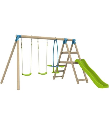 DESCRIPTION GÉNÉRALE Découvrez notre gamme de balançoires en bois pour amuser vos enfants de tout âge. Nos jeux de plein air sont certifiés à la norme française jouet et offrent un excellent niveau de qualité. SPÉCIFICATIONS TECHNIQUES Dimensions produit monté : L.316 x l.290 x H.190 cm Surface au sol : 9,16 m² Poids du produit monté : 100,92 kg Hauteur de la poutre : 190 cm Hauteur de la plateforme : 87 cm Longueur du toboggan : 175 cm Équipements : 2 balançoires / vis-à-vis / toboggan / kit d'ancrage Couleurs : Marron - bleu - vert Matériaux : Bois Traitement du bois : autoclave classe III Âge : 3 ans + Nombre d'enfants utilisateurs : 1 à 5 et plus Poids supporté : 50 kg par balançoire / 35 kg par assise du vis-à-vis / 50 kg sur toboggan Réservé à un usage domestique Garantie : 2 ans / 10 ans sur le bois INSTALLATION Nombre de colis : 7 Contenu des colis : Structure et composants / accessoires / visserie / notice de montage et d'utilisation À installer soi-même Ancrage au sol : oui ...