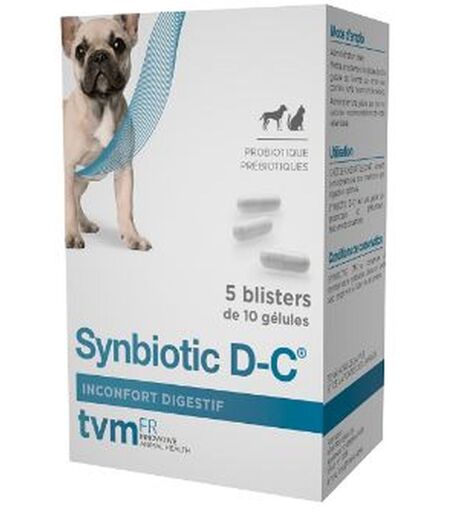 Synbiotic D-C TVM est un complément alimentaire qui permet de soutenir l'appareil digestif chez le chien et le chat. Le complexe Preplex : composé de FOS et de gomme d'acacia. Ces deux prébiotiques sont complémentaires et possèdent une durée et une localisation de fermentation différentes ce qui favorise la protection de la microflore tout au long de l'intestin. Le probiotique Enterococcus faecium : cette souche de bactéries lactiques est autorisée dans l'Union Européenne en tant qu'additif alimentaire chez les chiens. Son efficacité et son innocuité ont été évaluées et approuvées par l'Autorité européenne de sécurité des aliments. Les prébiotiques : ce sont des glucides non digestibles fermentés essentiellement dans le côlon, qui favorisent de manière sélective la croissance et/ou l'activité de bactéries bénéfiques. Il existe de nombreux prébiotiques utilisés dans l'alimenation animale tels que les FOS (fructo-oligosaccharides), les Bio-MOS (mannan oligosaccharides extrait de paroi cellulaire de souche de levure), la gomme d'acacia (ou gomme arabique) ou encore la pectine. La fabrication des probiotiques contenus dans Synbiotic D-C comporte un processus de lyophilisation au cours duquel les bactéries sont enrobées d'une épaisse membrane. Les bactéries lyophilisées sont inactives et se réactivent après leur ingestion et leur passage dans l'intestin grêle. La microencapsulation assure aux probiotiques une protection contre l'acide gastrique et garantit une durée de conservation de 2 ans.Lors de stress, changement alimentaire, ... Désordres intestinaux : alternance de selles dures et de selles molles, flatulences, en complément des traitements lors d'affections intestinales longues. Activation de la flore intestinale : pendant ou après un traitement antibiotique, ...FOS (fructo-oligosaccharide), capsule de gélatine, stéarate de magnésium. ...