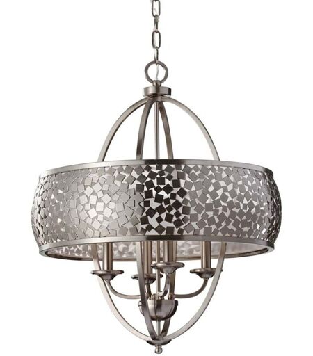 Description La remarquable collection Zara est un design contemporain avec des courbes classiques créant une gamme vraiment magnifique. Les pièces métalliques carrées en forme de mosaïque sont soudées individuellement à la main et pliées dans deux directions , créant un ajustement unique à chaque fois. Avec des teintes d'organza argenté presque translucides, ces raccords en nickel brossé sont complétés par l'ajout de diffuseurs en verre dépoli. Détails • Type de produit : Lustre • Hauteur en cm : 73.2 • Ø en cm : 61 • hauteur min en cm : 80.7 • hauteur max en cm : 233.2 • Matériau : Acier, Verre • Finition : Acier inoxydable brossé • Nombre de douilles : 4 • Puissance maximale : 60W • Douille : E14 • Ampoule incluse : non • Tension : 220-240V 50hz • Classe de protection : Classe I ...