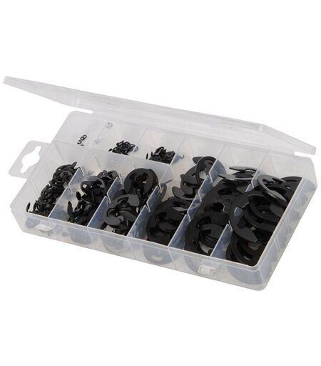Clips en "E" en acier noirci chimiquement également connus sous le nom de clips de retenue externes. Pour utilisation sur une multitude d'arbres en rotation ou sur axes de charnières. Tailles assorties 1,5 - 22 mm. Coffret compartimenté très pratique. ...