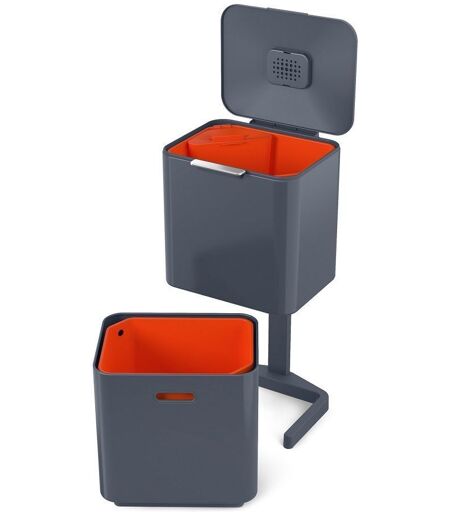 Poubelle de tri sélectif Joseph Joseph contenance 60L: 30L déchets ménagers, 30L déchets recyclables 3 bacs intérieur amovibles: 1 déchets ménagers, 1 déchets recyclables, 1 déchets organiques (3L) corps de la poubelle en acier peint couleur graphite bacs intérieurs en plastique couleur orange ...