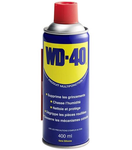 Produit Multifonction WD-40 400ml 33004 Chasse l?humidité : élimine rapidement les courts circuits induits par l?humidité Dégrippe : la forte adhérence de WD-40 au métal et ses propriétés lubrifiantes assurent ensuite le fonctionnement constant des pièces libérées Lubrifie : un des composants principaux de WD-40 est un lubrifiant actif et permanent Protège : Le film formé par WD-40 assure une protection contre l'eau, l'humidité et leur effets corrosifs. Cette action est durable et préventive Elimine les résidus : WD-40 peut être utilisé sur toutes les surfaces métalliques et plastiques. Ce produit ne peut pas être transporté par avion, pas de livraison DOM/TOM. Seuls le Transporteur TNT et le Transport spécialisé (Gros Volume) sont autorisés. ...
