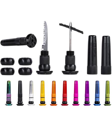 Kit Muc-Off stealth tubeless puncture plugs Quand l'impact d'une crevaison est bien trop gros pour que le préventif puisse faire office, le Stealth Tubeless Puncture Plug Muc-Off, intelligemment planqué dans votre guidon, est votre ultime recours !L'insert expansible en silicone s'adapte à la plupart des guidons de VTT, route ou Gravel, et l'embout en aluminium usiné CNC se décline en 10 coloris anodisés différents pour s'harmoniser avec votre monture.Ces kits légers et résistants contiennent tout ce dont vous avez besoin pour continuer votre sortie en cas de trou récalcitrant : un outil d'alésage 2 en 1 en acier inoxydable, une variété de mèches de tailles différentes et une lame de finition.Petit, léger et résistant, le Stealth Tubeless Puncture Plug est l'outil parfait pour colmater ces grosses crevaisons reloues et vous éviter les ennuis. Compacté et rangé dans votre guidon jusqu'à ce que vous en ayez besoin. Compatible avec la plupart des grips ouverts et embouts de guidon.CARACTÉRISTIQUES :- Aluminium 6061 usiné CNC.- Insert en silicone expansible, adaptable à tous les guidons de VTT, route ou Gravel. Diamètre interne de 17mm.- Fourni avec inserts en silicone de différents diamètres (17, 19 et 21mm)- Se visse dans le guidon avec une clé allen de 4mm- Bouche et répare les trous qui ne se colmatent pas au préventif- Compatible avec la plupart des grips ouverts et embouts de guidon avec une section de 84mm- Dimensions : 89x27x27mm- Poids : 33g par côté (sans les mèches)- Disponible dans 10 couleurs anodisées pour s'accorder avec vos valves tubeless Muc-Off ...