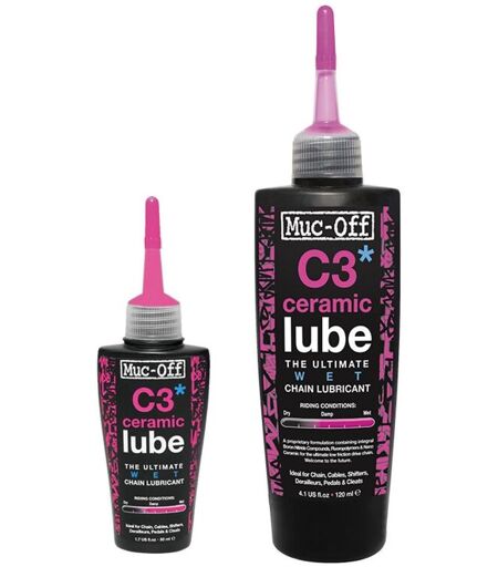 Lubrifiant Ceramic Muc-Off C3 Wet Lube 50ml La formule spécifique à base de fluoropolymère et de nano particules de céramique fait du C3 le lubrifiant le plus efficace du marché. Dans sa version conditions humides il dépose une couche de céramique sur votre chaine qui repousse la boue et lhumidité afin assurer une transmission douce et précise sur de longue distance et ce dans les pires conditions.Caractéristiques :- couche céramique pour une durabilité longue distance- réduit les frictions pour une efficacité de pédalage maximum- repousse lhumidité (waterproof)- Biodégradable à 95%- Idéal pour la route, cyclocross et VTTExiste en 120ml pour latelier et 50ml pour se faufiler dans votre sac à eau.Existe aussi en version 1L pour recharger en magasin et diminuer limpact des emballages sur la nature.Dangereux respecter les précautions d'emploi ...