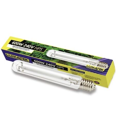 Ampoule HPS 600W double spectre (2100K) Lumatek amorçable par un ballast électronique, Class1 ou IP20 adapté à sa puissance. Son culot E40 la rend compatible avec les réflecteurs horticoles ouverts, à ventiler ou cooltube. Cette lampe Lumatek 90 000 lumens est conseillée pour l'éclairage de tous les végétaux sur une surface d'environ 1.5m2. Ampoule HPS 600W double spectre (2100K) Lumatek amorçable par un ballast électronique, Class1 ou IP20 adapté à sa puissance. Son culot E40 la rend compatible avec les réflecteurs horticoles ouverts, à ventiler ou cooltube. Cette lampe Lumatek 90 000 lumens est conseillée pour l'éclairage de tous les végétaux sur une surface d'environ 1.5m2. Cette lampe à impulsion 600W Lumatek est utilisable qu'avec un ballast adapté à sa puissance. Elle a été conçue à l'aide d'une technologie de tube à arc en céramique de haute qualité et d'un mélange de gaz horticole spécifique qui créera un rendement spectral optimal. Son tube à arc en céramique PCA lui permet ...