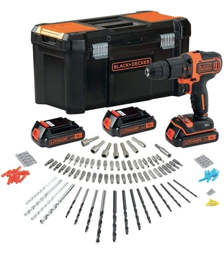 BLACK+DECKER BDCHD181B3A Perceuse-visseuse à percussion sans fil 18V avec 3 batteries 1,5Ah, 120 accessoires coffret