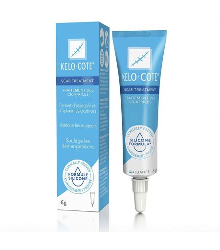 KELO-COTE® est un gel de silicone breveté qui aide à améliorer l’apparence des cicatrices.Les gels de silicone sont les traitements de 1ère intention des cicatrices selon les recommandations en vigueur.BénéficesAide à assouplir et aplanir la cicatriceCliniquement prouvéRéduit la rougeur, soulage les démangeaisons et l’inconfortConvient aux enfants et adultesTransparent et sans odeur (excepté les références UV)Forme un film souple 24h/24, résistant à l’eauPeut être recouvert de cosmétiquesIndicationGel de silicone breveté qui aide à améliorer l’apparence des cicatricesApplicationPour les cicatrices récentes : appliquer sur une cicatrice propre et sèche, une fois la cicatrisation terminée ou les sutures retirées.Appliquer une couche très fine de KELO-COTE® sur la cicatrice, 2 fois par jour, sans masser.Laisser sécher 5 minutes pour permettre la creation d’un film souple, transparent et résistant à l’eau – retirer le produit en excès si le film ne sèche pas. Une fois sec, peut être recouvert de crème solaire ou maquillage.Le traitement recommandé est d’une durée de 2 à 3 mois. Continuer le traitement si des améliorations sont toujours observées.IngrédientsPolysiloxanes, Dioxyde de silicium ...