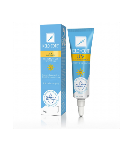 Prévention et traitement des cicatrices hypertrophiques et chéloïdes. Dispositif médicalKelo-Cote® UV est un gel de silicone cliniquement prouvé, conçu pour aider à améliorer l’apparence des cicatrices surélevées, qu’elles soient récentes ou anciennes*, qu'elles proviennent d'une chirurgie, d'une brûlure, d'une plaie, de l'acné ou d'un traumatisme. Kelo-Cote® est formulé spécialement pour la prévention et le traitement des cicatrices hypertrophiques et chéloïdes. Pourquoi choisir Kelo-Cote® UV pour vos cicatrices ? Tous les avantages du gel Kelo-Cote® avec protection solaire SPF 30 pour protéger des rayons UVB et prévenir la pigmentation des cicatrices. ✔Aide à Aplanir et assouplir la cicatrice✔ Aide à Réduire rougeurs et démangeaisons✔ Formule de 100% à base de silicone avec complexe Siliclear™✔ Sèche rapidement en 5 minutes** – Application facile et non collante✔ Résiste à l’eau. Protection pendant 24h*** – Protection longue durée✔ Convient aux peaux sensibles – 98,7% des patients ont jugé la tolérabilité "bonne ou très bonne" (1)✔ Utilisable chez les enfants dès 3 mois Pour quelles cicatrices ? Kelo-Cote s’applique sur une cicatrice une fois les sutures retirées et les croutes tombées : • Cicatrices post-traumatique (accidents domestiques, fractures ouvertes, coupures, lacérations, accidents de la route)• Cicatrices post-brûlure (feu, eau bouillante, huile, etc.)• Cicatrices de chirurgie esthétique (mammoplastie, liposuccion, blépharoplastie, abdominoplastie, lifting, etc.)• Cicatrices post-césarienne• Cicatrices post-thyroïdectomie• Cicatrices post-otoplastie• Cicatrices d’acné surélevées• Cicatrices post-exérèse de grain de beauté Le plus de Kelo-Cote® UV ? ...