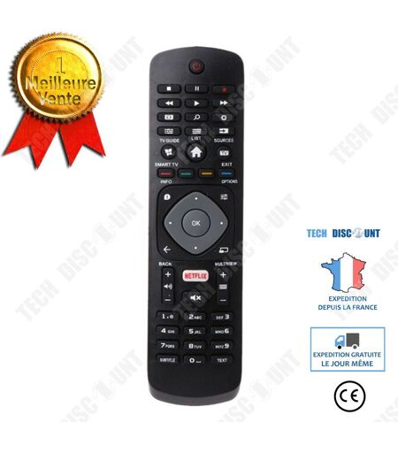 Nom du produit: Télécommande TV Smart pour PHILIPS 4K--DQ FRANCE Catégorie: TÉLÉCOMMANDE TV Caractéristiques: Type de produit: Convient à la télécommande Philips TV Matériau de la coque: ABS Distance de contrôle à distance: supérieure à 8 m (la distance réelle à distance dépend du modèle de votre téléviseur) Type de batterie: 2 * piles AAA (non incluses) Modèle applicable: Pour TV PHILIPS HOF16H303GPD24 NETFLIX Fernbedienung 398GR08BEPHN0011HL Taille: env. 20,3 * 5,3 * 1,6 cm / 8,0 * 2,1 * 0,6 pouces Poids du colis: 77 g Liste de colis: 1 * Convient à la télécommande Philips TV"" ""Matériau de la coque: ABS Distance de contrôle à distance: supérieure à 8 m (la distance réelle à distance dépend du modèle de votre téléviseur) Type de batterie: 2 * piles AAA (non incluses) Modèle applicable: Pour TV PHILIPS HOF16H303GPD24 NETFLIX Caractéristiques: -[Convient à la télécommande Philips TV]? Il s'agit d'une télécommande de remplacement pour PHILIPS HOF16H303GPD24 TV NETFLIX Fernbedienung 398GR08BEPHN0011HL. -[Réponse rapide]?Lorsque vous appuyez sur un bouton, la télécommande réagit immédiatement et permet à la télévision de terminer votre souhait rapidement. - [Distance de contrôle]? 8 m - La distance de télécommande est supérieure à 8 m (la distance réelle dépend du modèle de votre téléviseur). - [Long temps de travail]? 2 piles AAA lui permettent de fonctionner longtemps. -[ Le matériau ABS]? rend ce contrôleur portable et durable. Vous pouvez l'utiliser directement après avoir installé les piles. -[Entreprise et marque française TECH DISCOUNT]: Notre entreprise TECH DISCOUNT fabrique et vend ce produit de qualité supérieure par rapport aux produits de même type sur le marché (Même si les photos sont similaires, ils ne sont pas conçus de la même façon et les vendeurs n?offrent pas les mêmes services après-vente). Chaque produit subit un contrôle strict avant son expédition qui vous permettra de recevoir votre produit en excellent état. En cas de problème de qualité, nous effectuerons un échange gratuit sous 14 jours. Expédié depuis la France le jour même de la commande et vous la recevrez dans les meilleurs délais (contrairement aux autres vendeurs qui ne peuvent pas garantir le temps d'expédition ou qui expédient depuis l'étranger et dont service après vente est généralement insuffisant). Notre service après vente se tiendra à votre écoute pour vous répondre efficacement. -[A l?attention des autres vendeurs]: Ce produit est vendu exclusivement sous notre marque française TECH DISCOUNT. Il est interdit d'ajouter cette offre dans votre catalogue. Nous avons le certificat d?enregistrement de marque INPI ainsi que le brevet. Toutes les ventes de contrefaçon entraîneront l?ouverture d?une enquête ainsi qu?une poursuite en justice et la fermeture de votre boutique. Merci de votre compréhension. ...